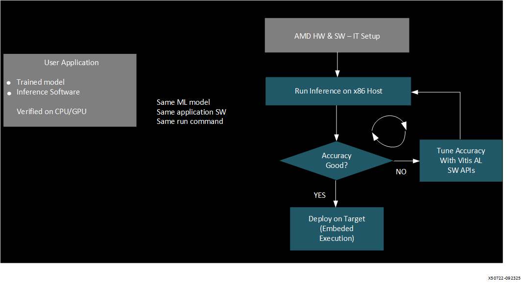 The figure outlines the process for deploying a machine learning (ML) model using Vitis AI across different hardware environments based on the execution of embedded platforms. The initial step involves setting up the IT environment with the necessary AMD hardware and software. After training the ML model, the next step is to verify its performance on CPU/GPU platforms. This involves running the inference on an x86 host and ensuring accuracy. If the initial accuracy is not satisfactory, the model might need to be retrained or fine-tuned with Vitis AI tools. After the accuracy is validated, you can proceed with the deployment by choosing embedded execution for integrated systems.