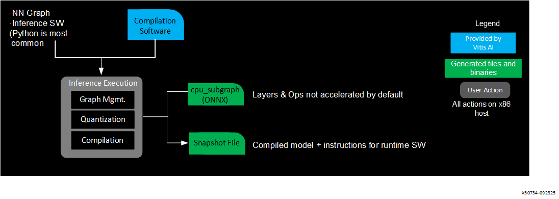 The Vitis AI Compiler, in collaboration with the NPU IP software stack, generates snapshots tailored for the deployment of each network. The snapshot contains a quantized model and instructions for execution by NPU IP on the target platform.