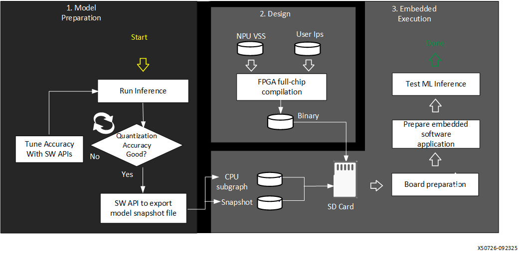 The final step is embedded execution, which includes board preparation, copying the input videos/images, snapshots, and sub-graphs (generated in the first step) to the SD card, and using the application software with Vitis AI runtime APIs to execute the model/snapshot and generate inference results on the target. Refer to the following figure which consolidates the steps of the embedded execution workflow.