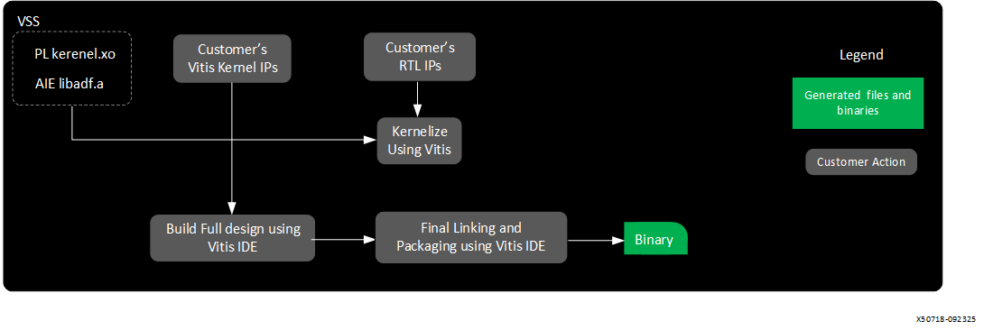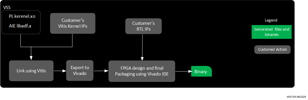 In the Vivado IDE flow, Vitis is used to integrate the VSS and your Vitis kernel IPs and link them together. The output of linking can be exported to Vivado as shown in the following figure. Now you can integrate your custom RTL IPs into the design, build the complete design, and generate the binary using the Vivado IDE. Refer to the following figure for the Vivado IDE design flow.
