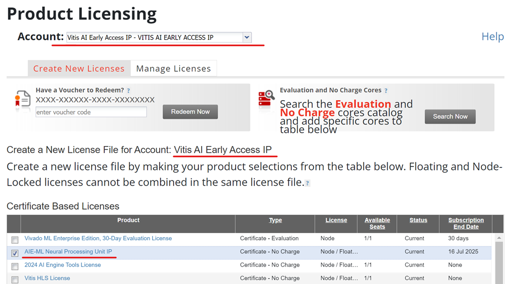 The free NPU IP license is required to build the Vitis AI reference design. You should have received an email with the subject line “Xilinx Download Invitation for Account Access”. The purpose of this is to ensure that you have access to generate the free NPU IP license. After you receive the email, go to your Xilinx licensing account and you can note the addition of the VITIS AI Early Access IP account visible in the drop-down menu, as shown in the following image. You can use this account to generate a license for the AIE-ML NPU IP and install that license on your build machine.