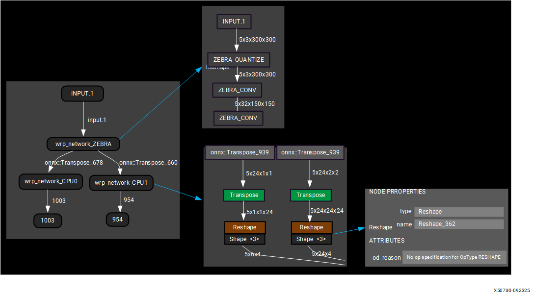 The Vitis AI NPU software stack converts your model to ONNX and then splits the main model graph into sub-graphs named CPU sub-graph and Vitis AI Software (FPGA) sub-graph, depending on the layers supported by NPU IP. The CPU sub-graphs are run by the ONNX runtime, and the Vitis AI software sub-graph is accelerated by the NPU IP. The following is an example of graph splitting visualized using Netron.