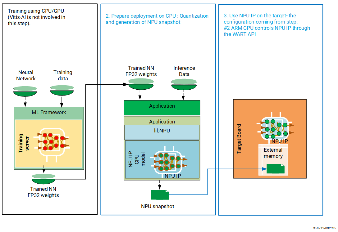 The first step in the previous diagram is “Model Training,” in which Vitis AI (NPU IP) is not involved. The second step is the model compilation process, in which the software stack of the NPU IP generates a description of the configuration of the NPU IP for the trained model, tailored for inference on NPU IP hardware. This description is commonly referred to as a snapshot. A snapshot contains all the necessary information required for efficient execution, including layer descriptions, weights, and input/output shapes.