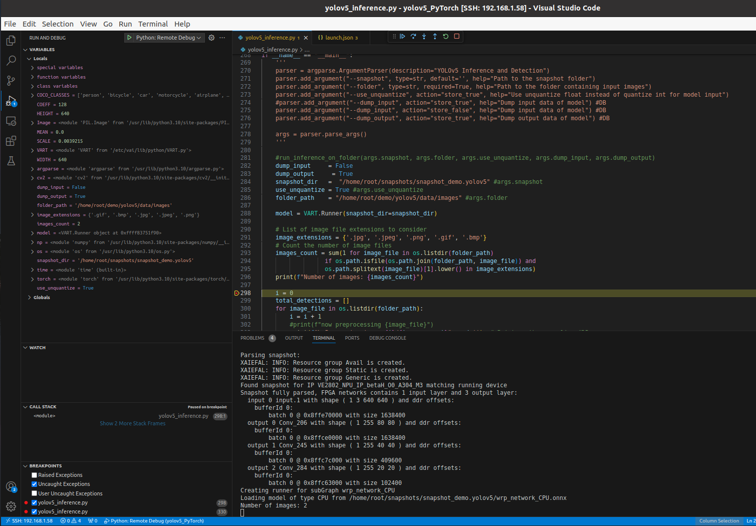 Click the Run and Debug (CTRL+SHIFT+D) icon on the left column, then click the green button, which starts Python Remote Debug (F5). You see something similar to the Settings of MS Code Studio SSH remotely connected to VEK280 board image.