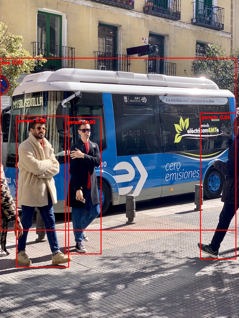 Annotated image saved to: bus_detection_results.jpg Class: person, Score: 0.90, Box: [227.49609375, 396.5625, 339.50390625, 865.6875] Class: person, Score: 0.87, Box: [48.09375, 379.6875, 241.734375, 929.8125] Class: person, Score: 0.84, Box: [674.89453125, 383.0625, 803.35546875, 879.1875] Class: bus, Score: 0.56, Box: [0.0, 200.8125, 799.875, 784.6875]