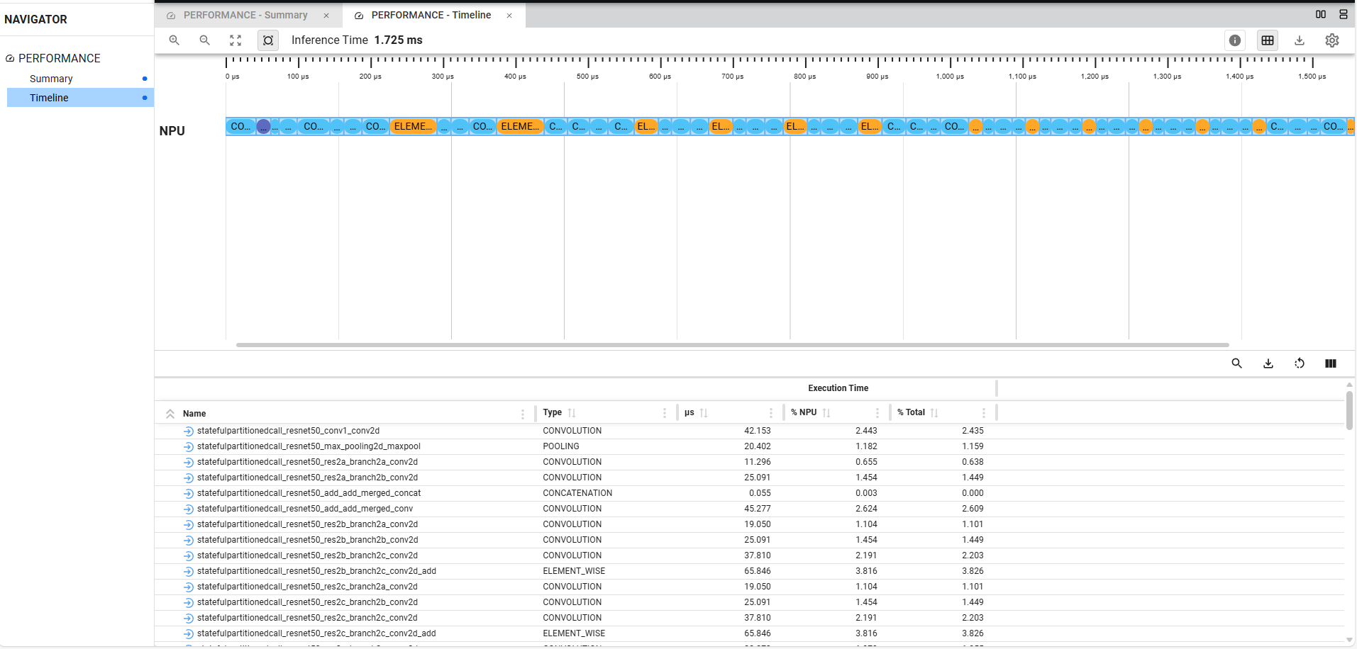 Run the NPU Runner Python application with the ResNet50 model, with –in_native option to avoid quantize and input reorder times in performance summary table: